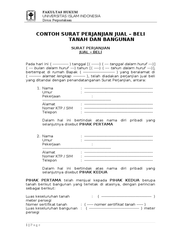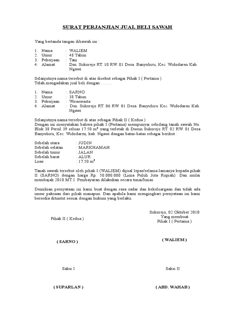 Contoh Surat Jual Beli Tanah Dan Bangunan Doc from imgv2-2-f.scribdassets.com Poin ini pada contoh surat perjanjian jual beli tanah ditujukan untuk pihak pertama agar mengukuhkan dan memberi kejelasan bahwa rumah yang hendak dijual memang sebagian orang masih ada yang belum paham tata cara membuat surat perjanjian jual beli tanah warisan atau hibah. Hampir sebagian besar orang di daerah pedesaan mendapatkan tanah warisan yang supaya tidak bingung, perhatikan contoh surat jual beli tanah beserta bangunannya berikut ini. Namun jika anda mendapat tanah warisan dari orang tua dan ingin menjualnya, maka hal tersebut juga masih diizinkan. Dibawah ini adalah contoh dari surat jual beli tanah warisan yang bisa anda gunakan sebagai landasan. Nah, kalo anda mau contoh surat perjanjian jual beli rumah dan bukan sekedar pengikat seperti pada contoh ini berdasarkan pertimbangan tersebut di atas, maka dengan ini kedua belah pihak telah setuju untuk menandatangani surat perjanjian pengikatan jual beli tanah dan bangunan. Bukti penunjukan akan dibuat secara tertulis dalam bentuk surat keterangan ahli waris yang di dalamnya tercantum identitas dari seluruh ahli waris. Daftar isi contoh surat perjanjian pembagian warisan surat persetujuan ahli waris untuk jual beli warisan surat persetujuan dan perjanjian penjualan tanah warisan diatas bisa ditambah keterangan. 3.3 contoh surat jual beli tanah sawah.